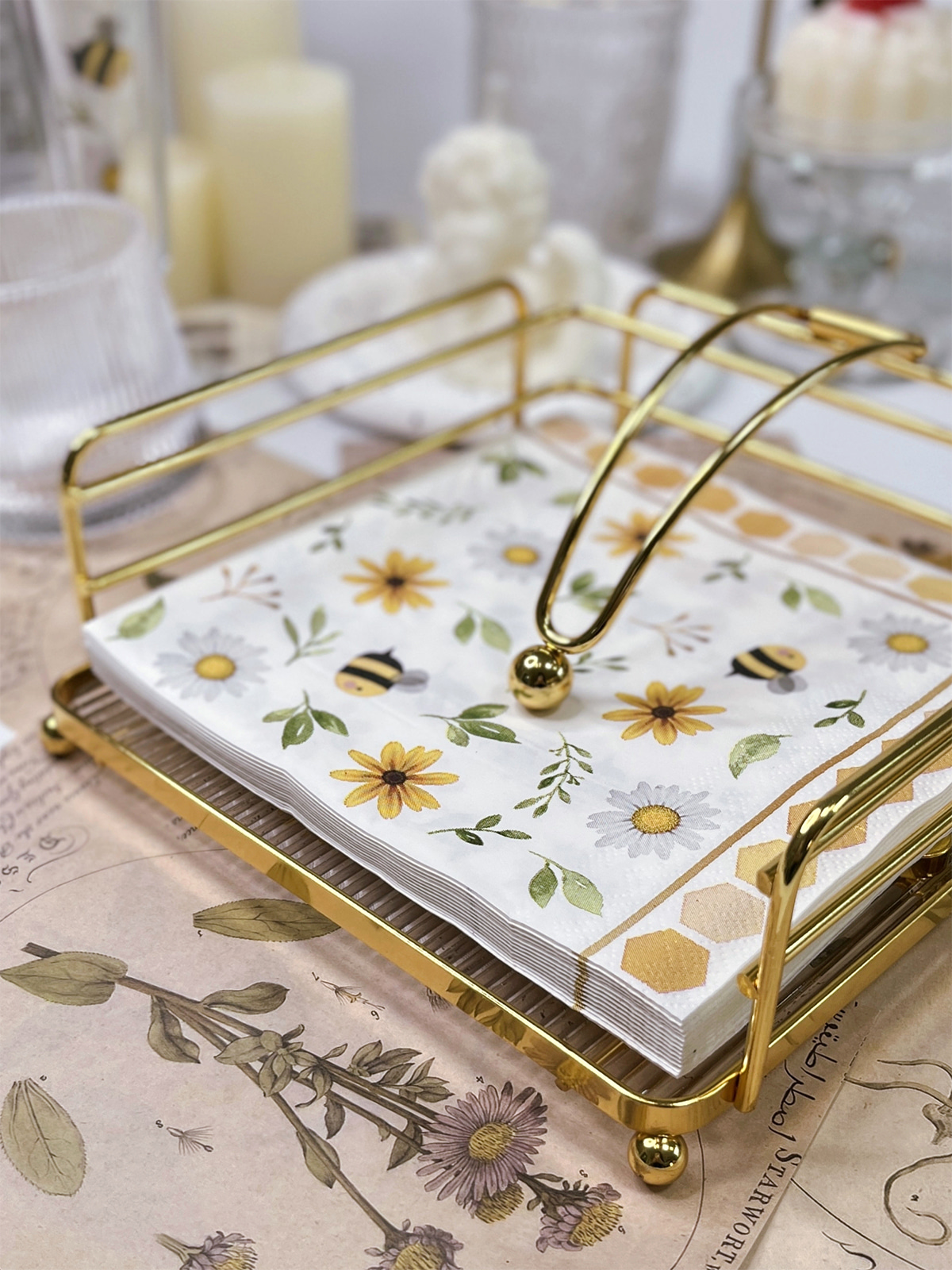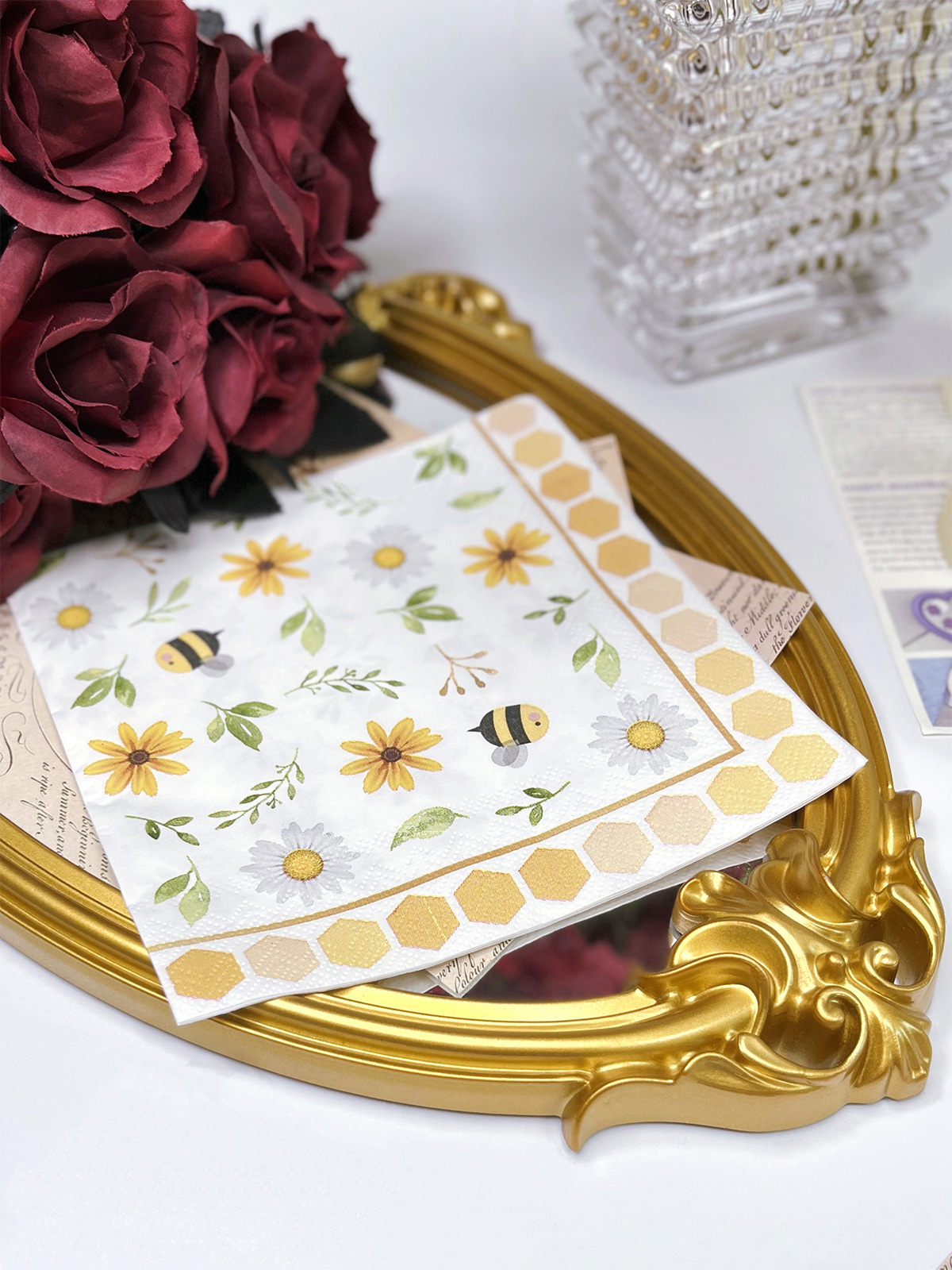 Serbet Pringting makan siang Lebah dan Bunga 3 Lapis, Serbet Kertas Hias untuk Makan Malam, Pesta ini terbuat dari 99,99% pulp kayu perawan, lembut dan berdaya serap tinggi, tahan luntur warna yang kuat, dan 3 lapis untuk memastikan tidak mudah sobek, lembut, tebal, dan tahan lama.