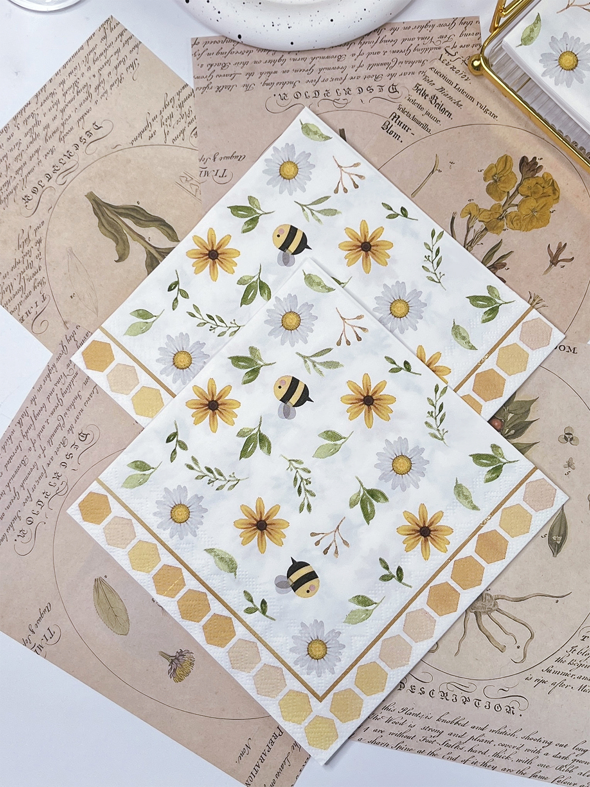 Serbet Pringting makan siang Lebah dan Bunga 3 Lapis, Serbet Kertas Hias untuk Makan Malam, Pesta ini menampilkan pola lebah dan bunga liar dengan latar belakang putih, desain ini sangat indah dan cerah, menambahkan tambahan yang bagus ke meja pesta Anda.