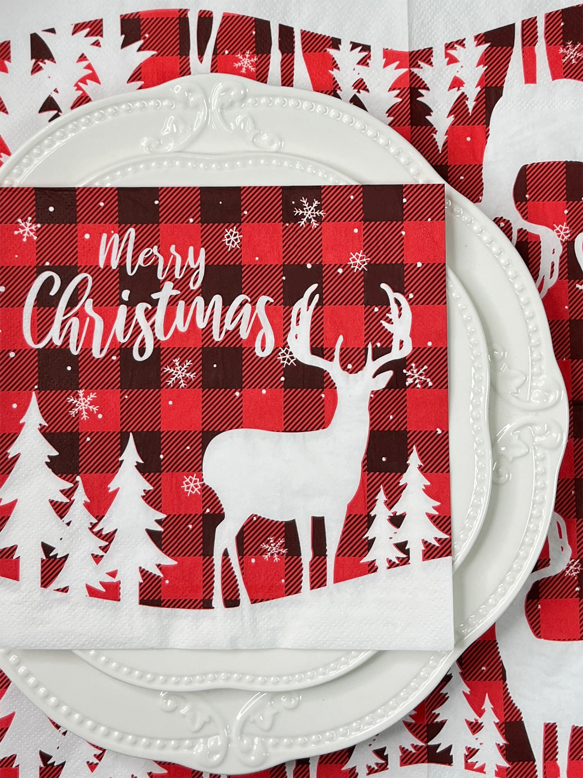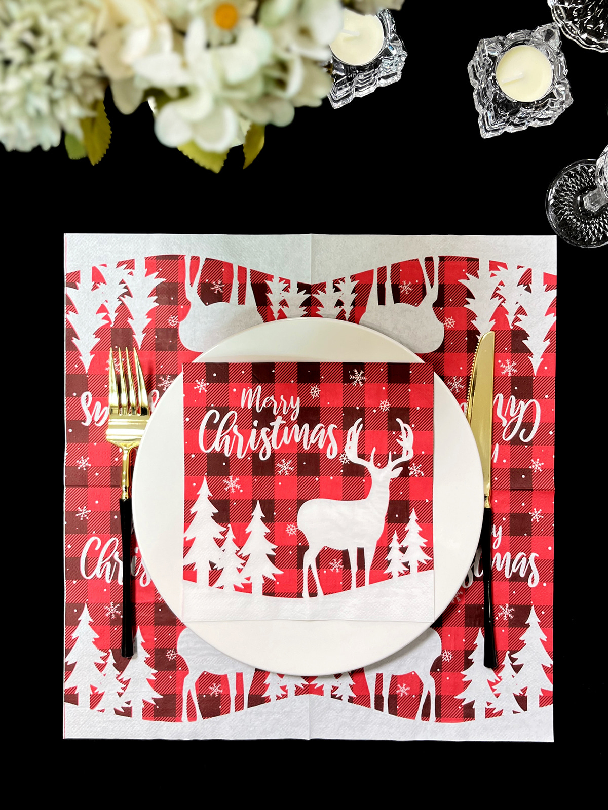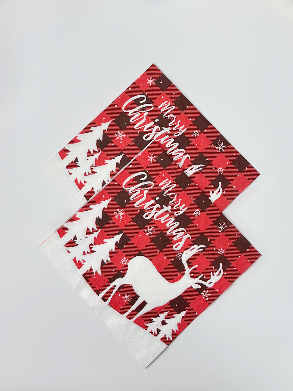 Serbet Kertas Hias Natal Merah, Kertas Serbet untuk Decoupage ini dirancang dengan beberapa elemen Natal klasik, seperti pohon Natal, rusa kutub, dan kepingan salju dengan latar belakang kotak-kotak merah dan hitam. Desain ini memberi Anda dan keluarga perasaan hangat dan menyenangkan serta menciptakan cita rasa Natal yang kuat.