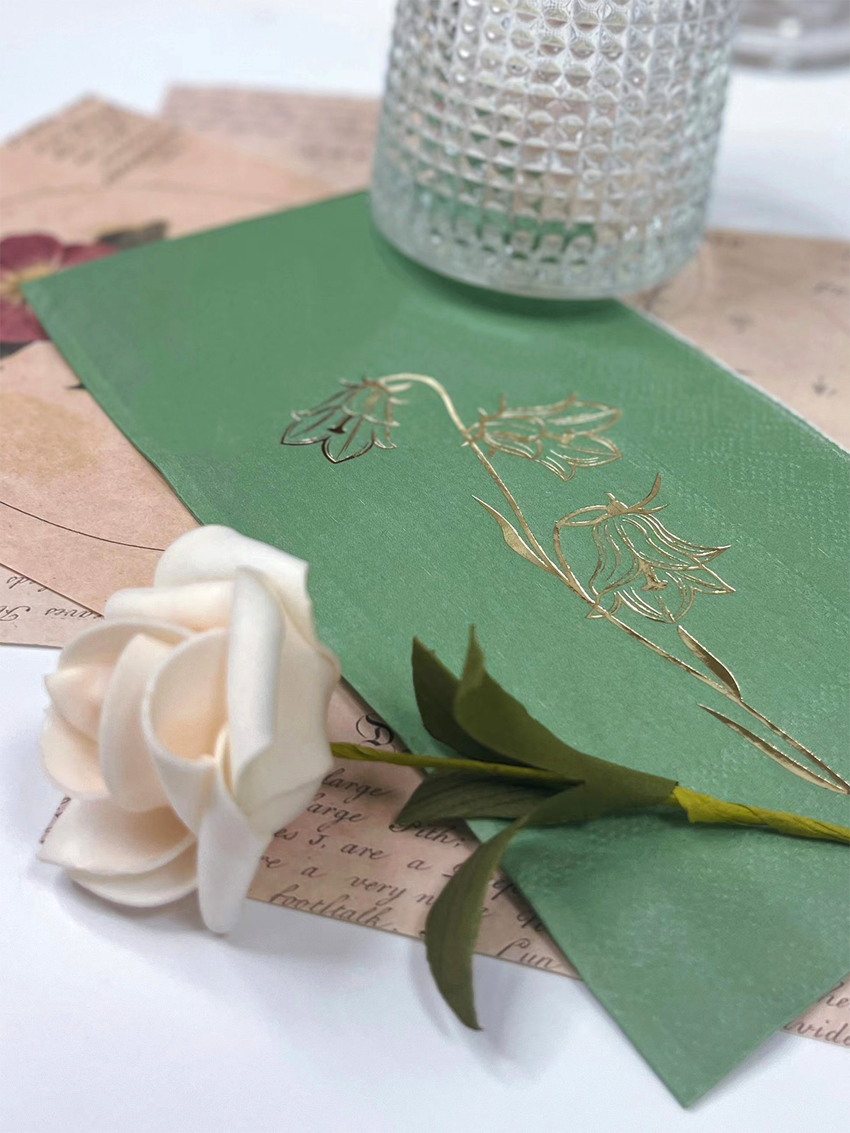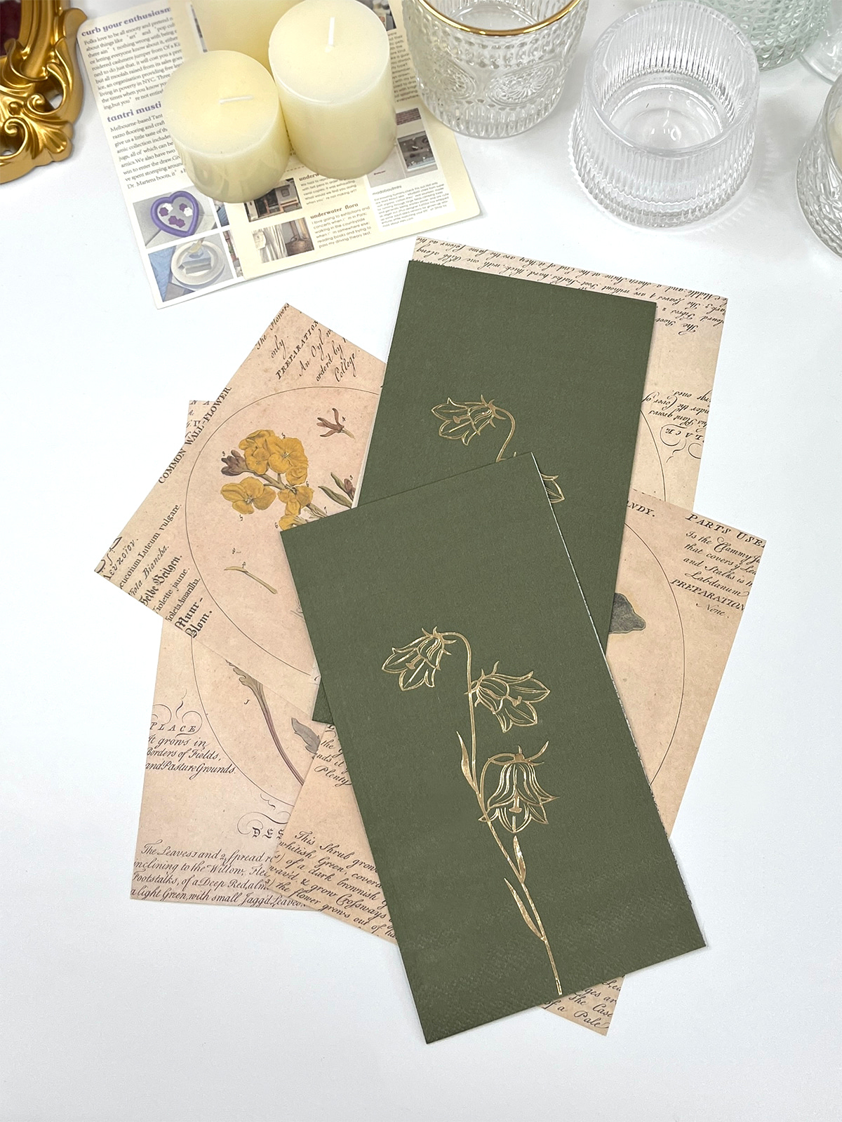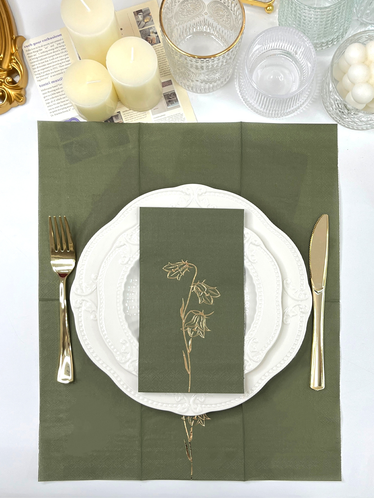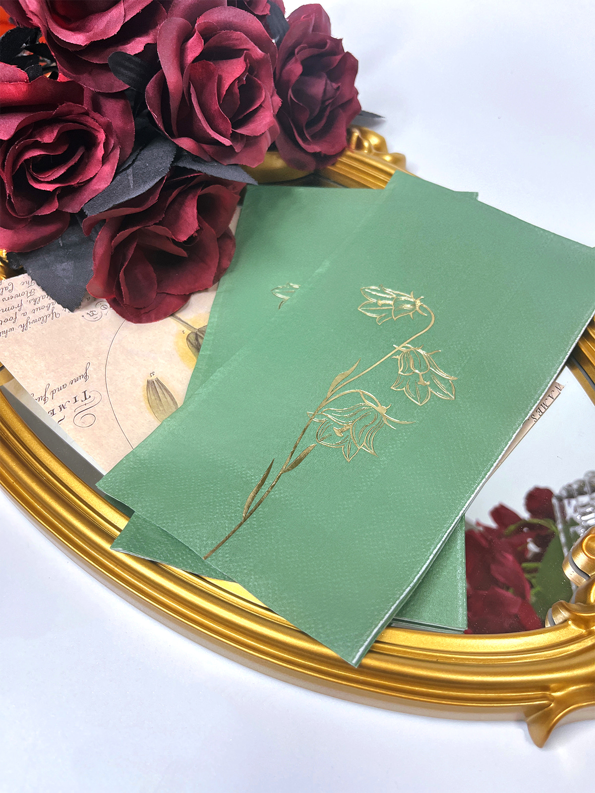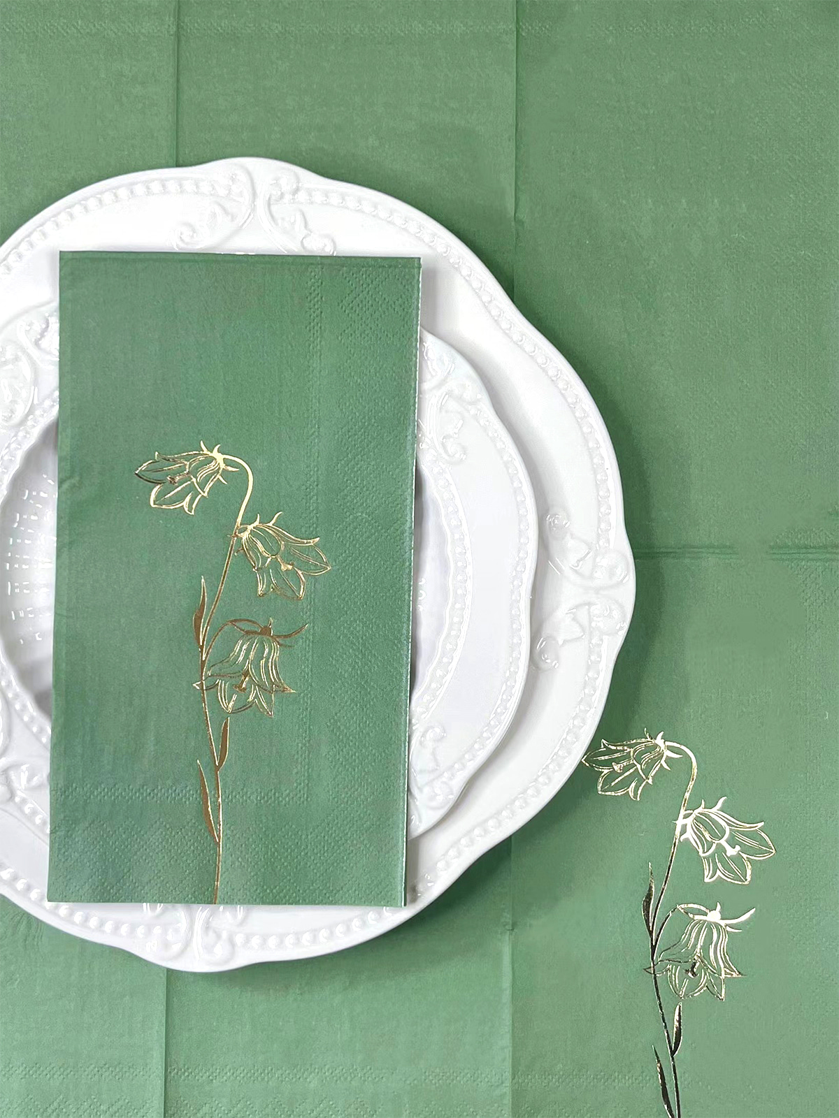 Serbet tamu lily foil emas dari lembah menampilkan desain bunga yang rumit dengan latar belakang hijau dan hijau tua. Mereka adalah dekorasi pesta yang menarik dan elegan, cocok untuk pernikahan, makan malam, kamar mandi, dan banyak lagi.